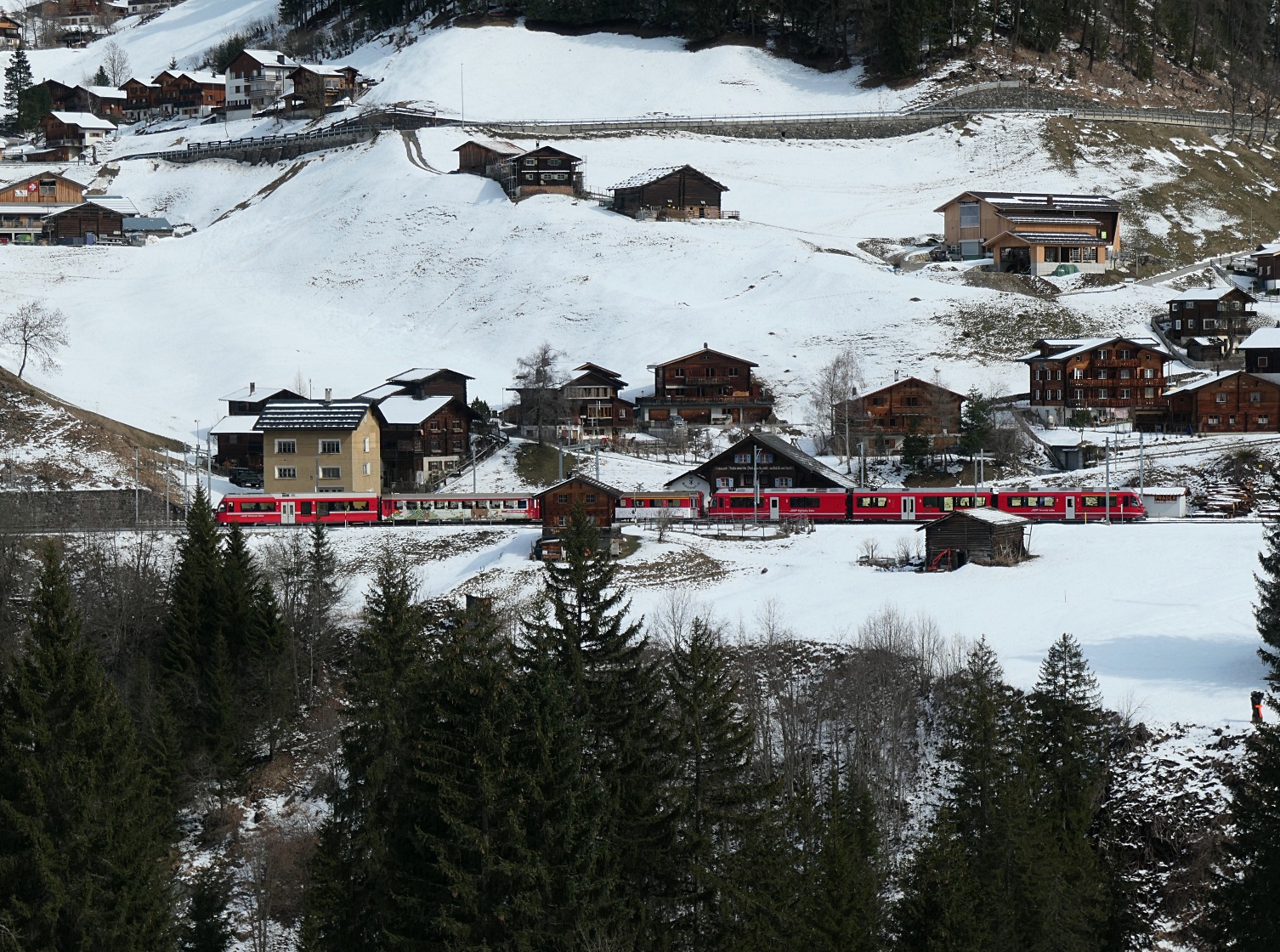 Leider sind wir ein paar wenige Minuten zu spät, denn dieser RhB-Zug ist gerade über den Langwieser Viadukt gefahren und hält nun hier an der Station Langwies